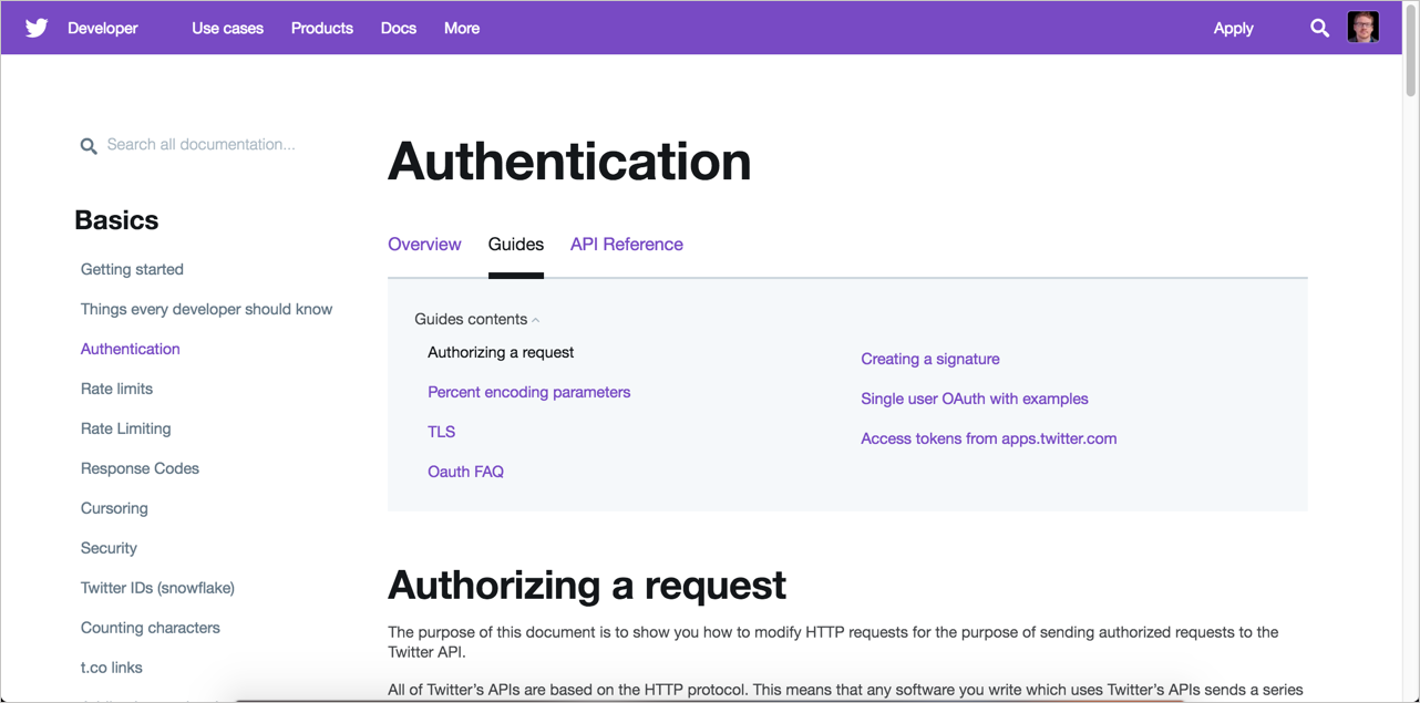 В Twitter подробный пример оправдан и предоставлен, поскольку требования к авторизации OAuth 2.0 немного сложнее.