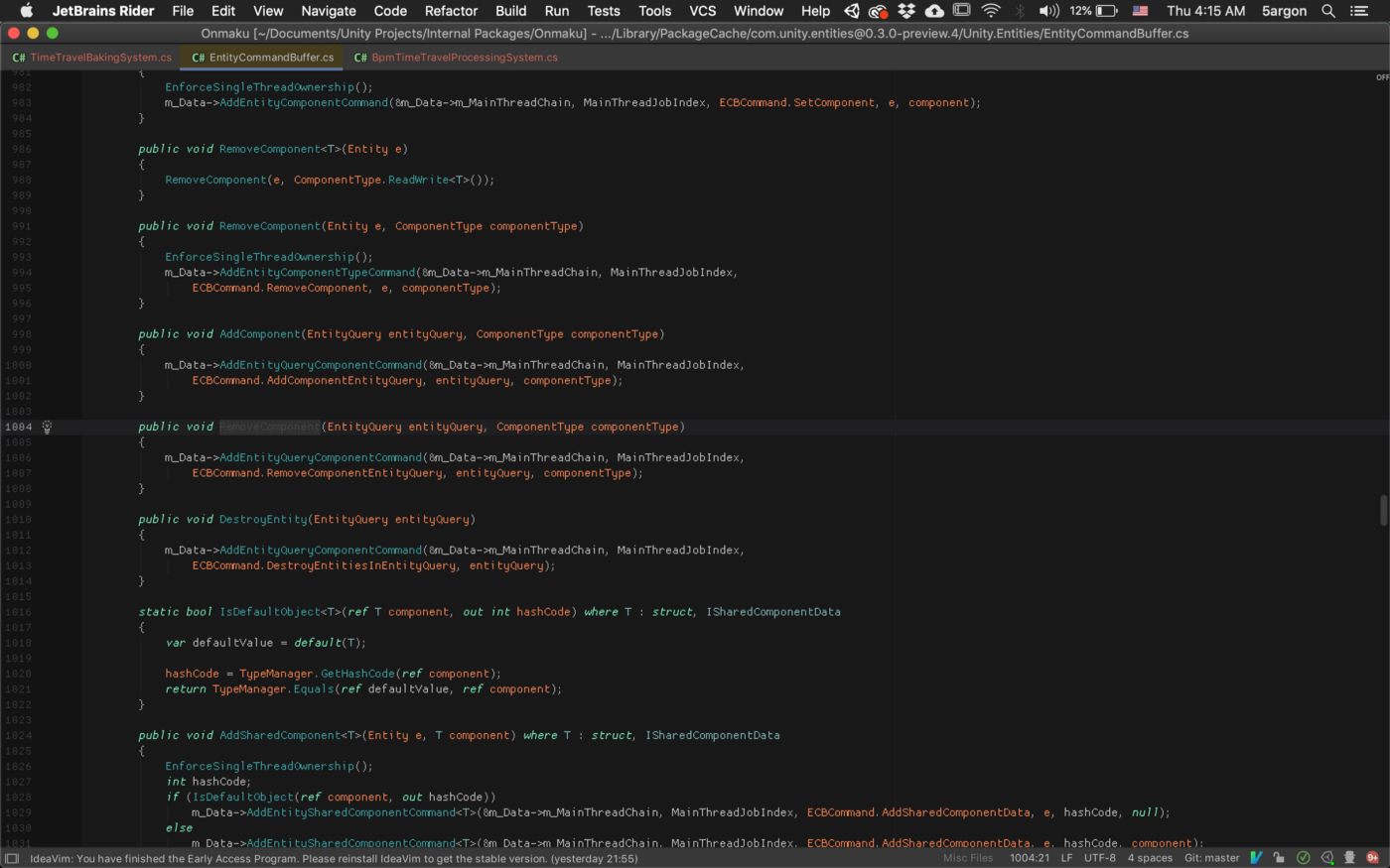 Rider тут побеждает, потому что знает о пакетах Unity UPM. Например, если вы желаете использовать EntityCommandBuffer.RemoveComponent: