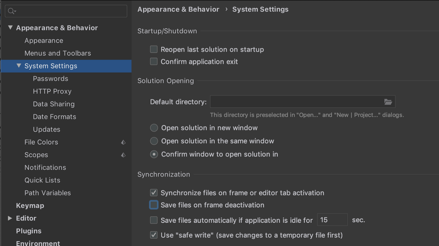 Похоже, что Rider любит сохранять ваши файлы автоматически или делать странные вещи для того, чтобы вы чувствовали себя неуверенно по поводу того, был ли файл сохранен или нет. Это очень ужасно с Unity, где время итерации является очень весомой проблемой. Например, когда вы вернетесь в Unity, все файлы будут автоматически сохранены. Вы не можете оставить файл в “dirty state”, перейти Unity и вернуться. Вам придется сталкиваться с задержкой на 5–10 секунд каждый раз. К счастью, вы можете отключить такое поведение: