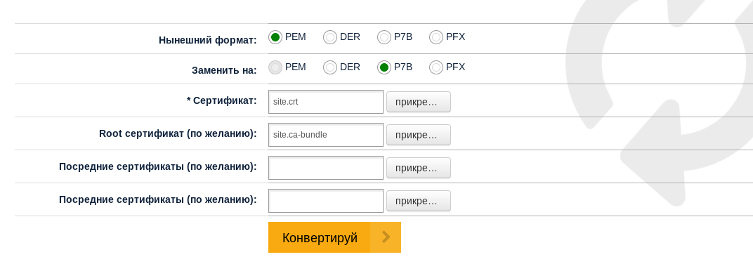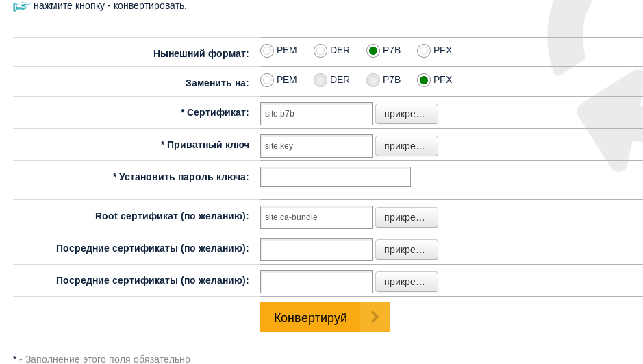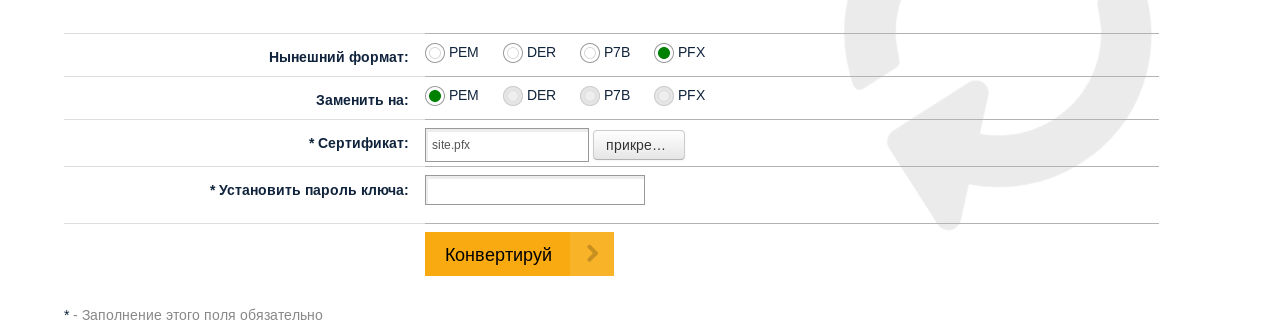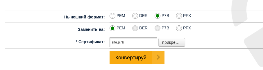 — эти форматы представляют собой двоичный формат для хранения сертификата сервера, промежуточных сертификатов и закрытого ключа в одном зашифрованном файле. Файлы такого формата сертификата используют расширение.pfx and .p12. PFX файлы обычно используются на windows машинах для импорта/экспорта сертификатов и закрытого ключа.