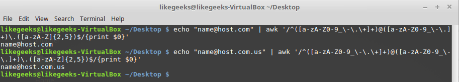 $ echo «name@host.com.us» | awk ‘/^(+)@(+)\.({2,5})$/{print $0}’