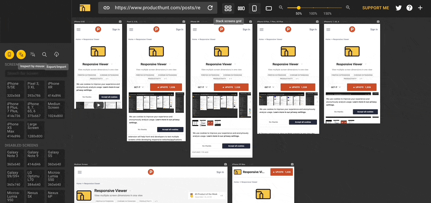 Когда нужно протестировать, как работает приложение на разных размерах экрана, можно использовать Responsive Viewer — расширение позволяет сделать это одновременно. Можно переключаться между режимами телефона и планшета, много предопределенных размеров экрана для разных девайсов.