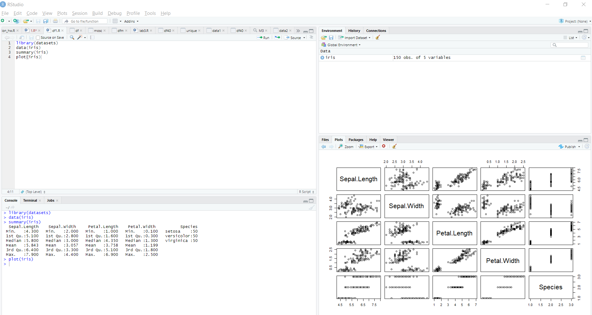 Интерфейс RStudio для Windows: есть отдельные области для написания кода, отображения переменных и графиков