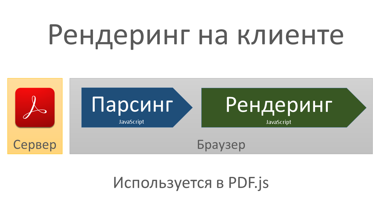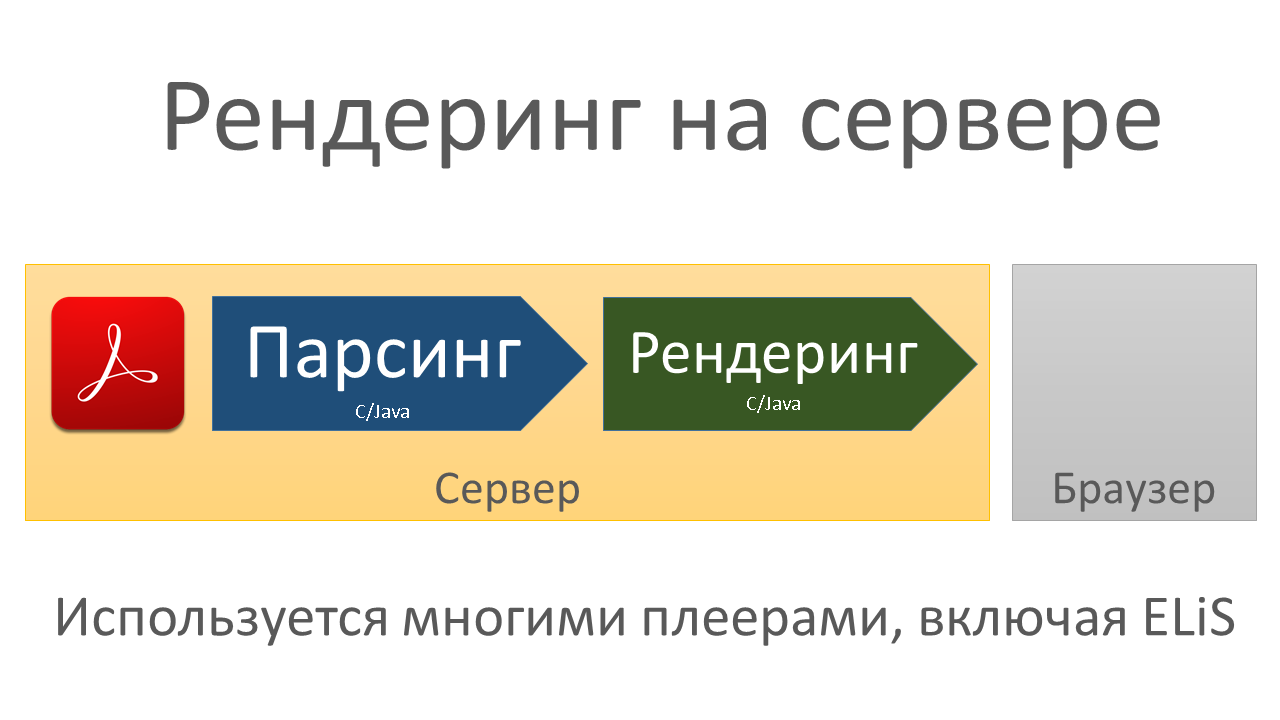 Изначально файл PDF находится на сервере. Стадия визуализации в интересующих нас случаях всегда производится в браузере. А вот парсинг и рендеринг могут производится как на сервере, так и на клиенте (браузере). PDF — большой и сложный формат, поддерживающий разные типы шрифтов, алгоритмов сжатия текста и несколько форматов встроенных рисунков, поэтому довольно мало ПО полностью реализовавшего весь функционал PDF. Парсинг и рендеринг осуществляется всего несколькими программами, которые называют библиотеками рендеринга PDF.