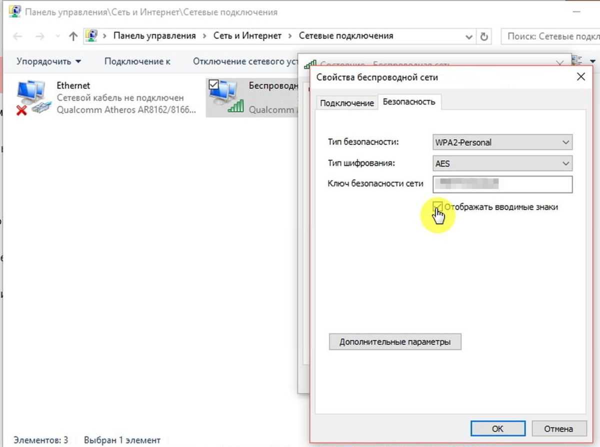 Теперь перейдите к «Управлению беспроводными сетями». В контекстном меню беспроводной сети выберите «Свойства», на вкладке «Безопасность» нажмите на «Отображать вводимые знаки». Так вы сможете еще раз посмотреть свой пароль WLAN.