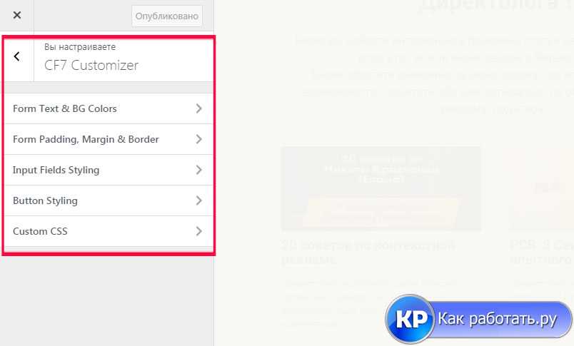 После активации плагина, перейдите в раздел «Внешний вид — Настроить», это стандартная страница настройки вашей темы(шаблона). Там вы найдете вкладку «CF7 Customizer».