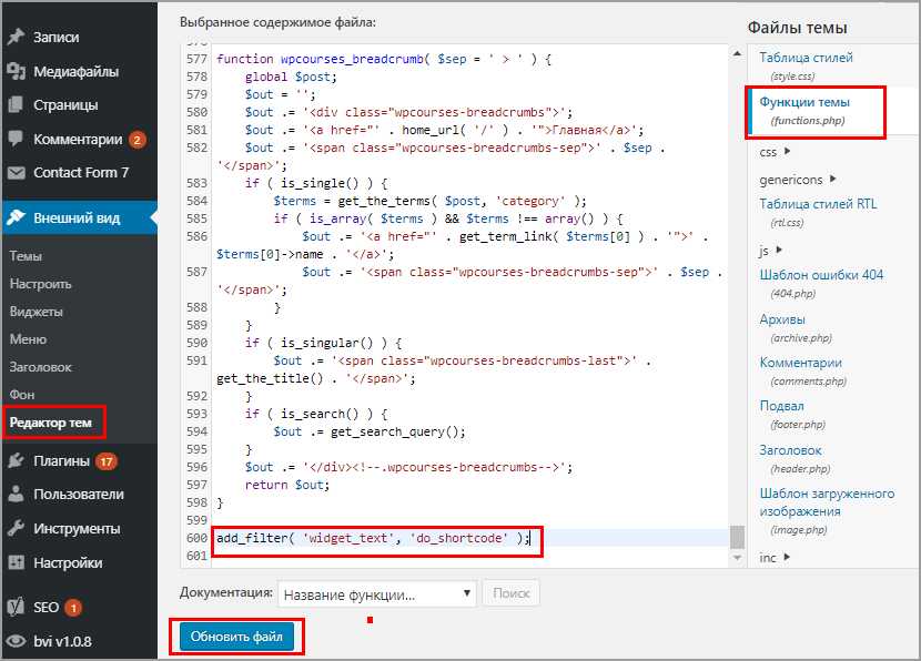 Смотрим, если сработало, то дальше можно не читать, если нет, то продолжаем. Не знаю от чего зависит, но иногда Текст не срабатывает, из-за того что WordPress запрещает вывод шорткода, тогда идем в файл Function активной темы, помещаем следующее правило и сохраняем.