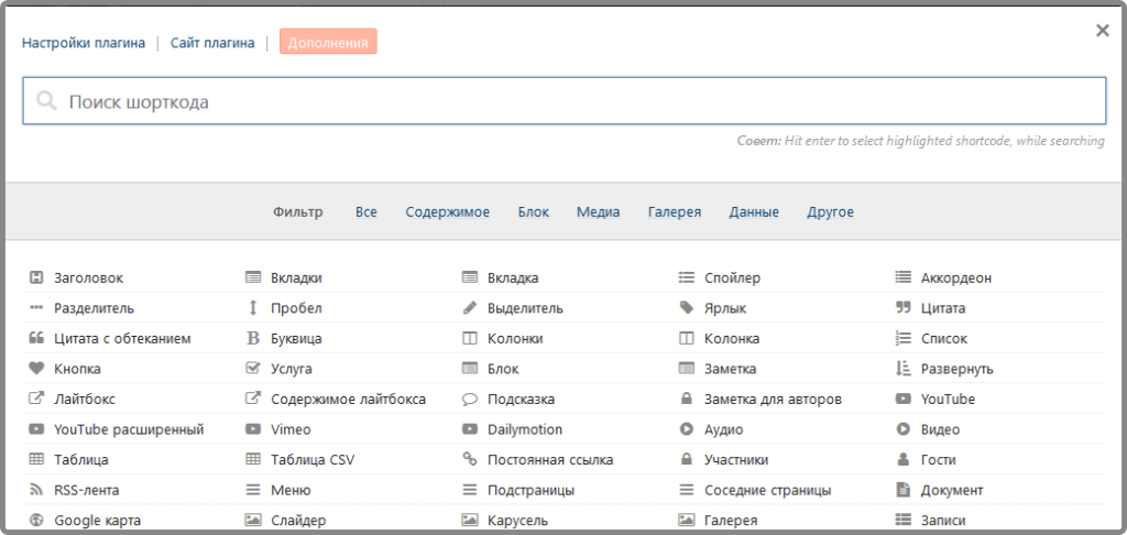 Мировой лидер по коллекции элементов для расширения возможностей и визуальной составляющей при помощи шорткодов. Расширение предполагает внедрение кодов в посты, страницы и файлы темы. С его помощью можно создать слайдеры, кнопки, блоки, видео-вставки, карусели. В визуальном редакторе добавляется отдельная кнопка, открывающая меню плагина.