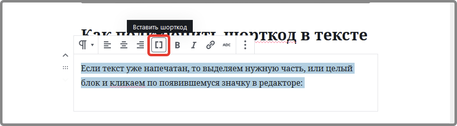 Но мне кажется, что в данном случае не получится выделить текст и вставить шорткод. Правильным будет при выборе нового блока сразу выбрать данную функцию и вставить текст уже сюда.