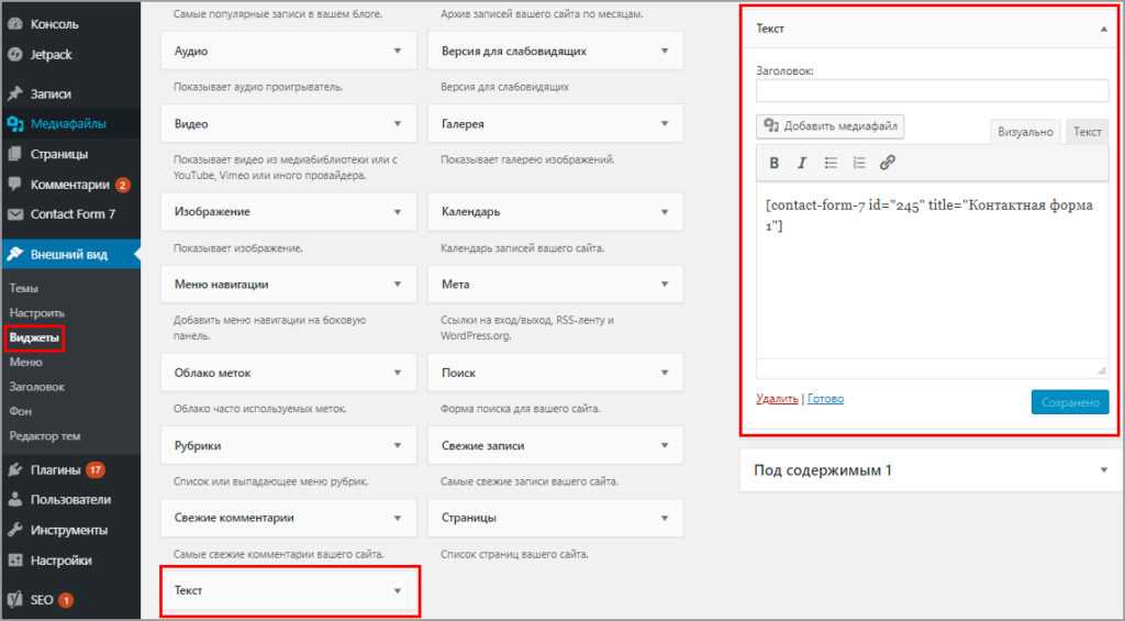 С помощью модуля Текст можно вставить шорткод, но это касается WordPress версий 5.0 и выше. Смотрим на скриншот, перетаскиваем его в активную зону и сохраняем изменения.