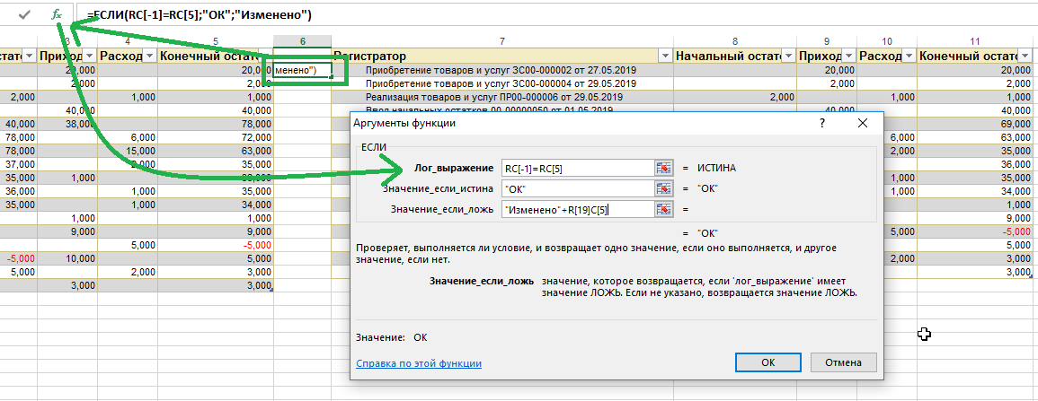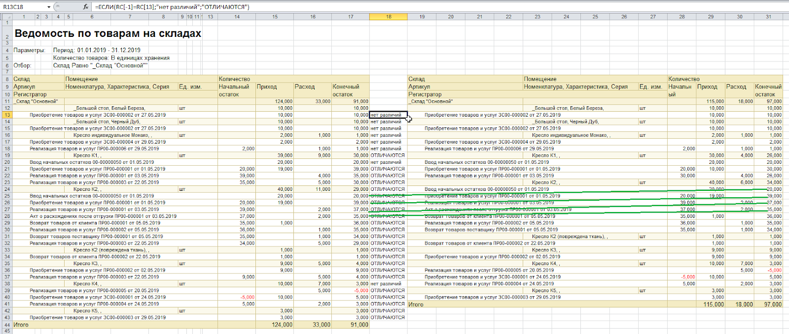 В скрине-примере видно, что гораздо больше итогов с выводом «отличаются», что не соответствует действительности — некоторые строки с одним и тем же регистратором не располагаются друг напротив друга. Выбранная функция этот момент не контролирует, поэтому вышли ложные результаты. Чтобы исключить такие ошибки, прежде чем использовать формулу, необходимо обе таблицы вручную откорректировать и проставить строки с одним и тем же регистратором в одну линию.