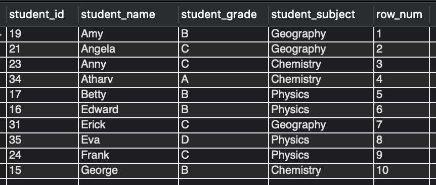 SELECT student_id, student_name , student_grade, student_subject FROM (SELECT ROW_NUMBER() OVER ( ORDER BY student_name ) row_num, student_id, student_name , student_grade, student_subject FROM students_data ORDER BY student_name) as student_data_temp WHERE row_num <11;