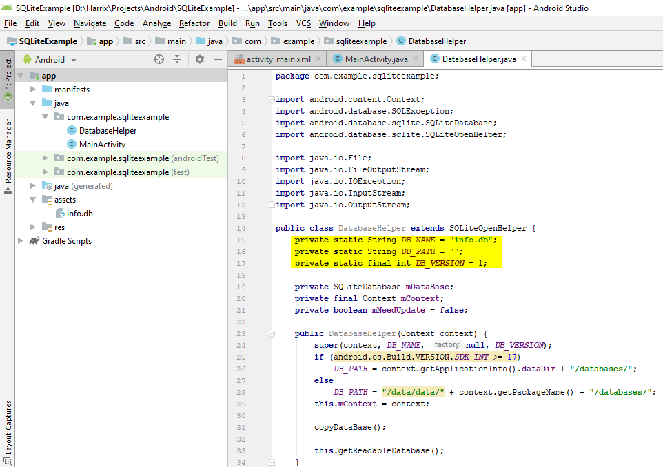 — самая интересная переменная (причем в примерах в сети по работе с готовой БД её обходят стороной). Это номер версии БД. Ниже описан принцип работы данного класса. Например, вы пишите справочник рецептов под Android и рецепты храните в БД. В момент создания установки приложения программа должна скопировать БД на устройство. Потом через какое-то время вы решили обновить приложение, и БД у вас обновилась: структура БД поменялась, добавились новые рецепты. И вам нужно заменить старую БД на новую. Вот тут вы и пропишите в данной переменной новую версию БД. И при открытии приложения будет произведена проверки версии БД, и файл БД обновится. Вначале версия БД равна 1.