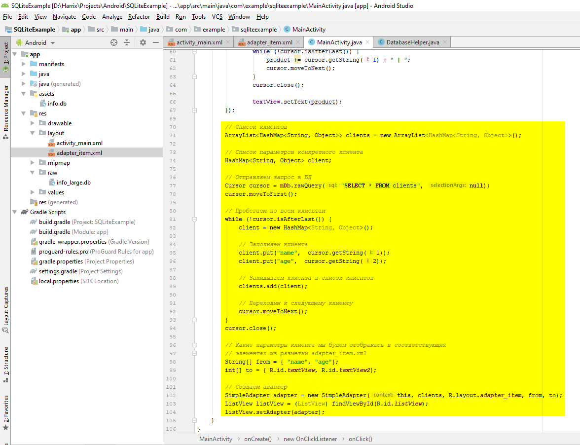 После этого мы заполняем нашу таблицу данными, используя для этого метод адаптера. Как только мы заполнили данными нашу таблицу, мы можем приступать к чтению данных по каждой записи. Для этого в примере использован цикл foreach в котором мы проходимся по каждой строке таблицы и в каждой строке читаем поля id, name и family каждой записи, используя обобщенный метод , который позволяет привести данные поля к необходимому нам типу.