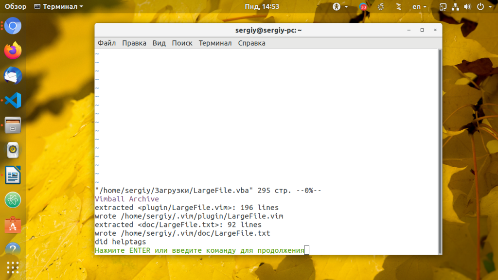 Наберите :so % и нажмите Enter, чтобы Vim установил расширение в домашнюю папку. Затем можете набирать :q для выхода. Плагин будет установлен в ~/.vim/plugin/LargeFile.vim и вы сможете его использовать.