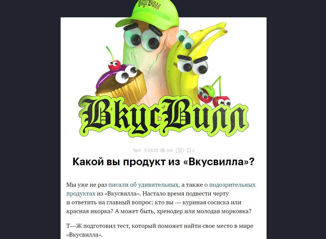 Еще был отличный проект в виде теста совместно со ВкусВилл. Забавная штука, в которой хоть и есть упоминание бренда, но отсутствует прямая реклама.