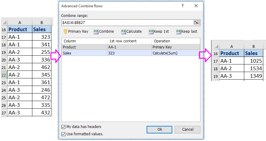 Если у вас есть Kutools for Excel, вы можете быстро удалить дубликаты, но сохранить только самое низкое или самое высокое значение с помощью Расширенные ряды комбинирования функции.