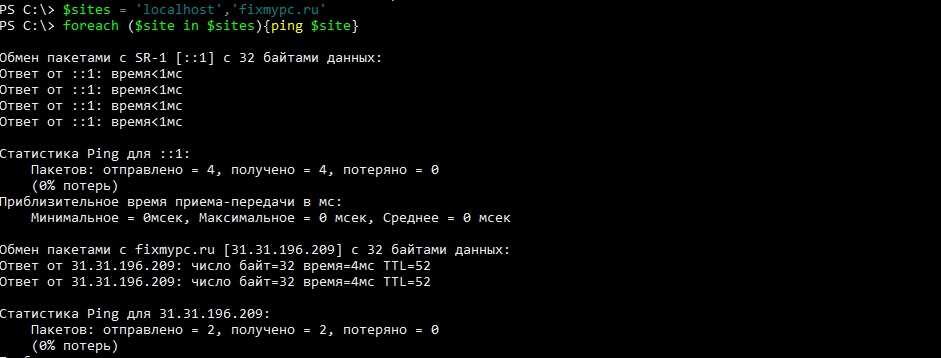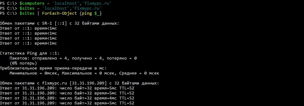 В примере ниже мы проверим доступность хостов передав каждый объект массива через конвейер: