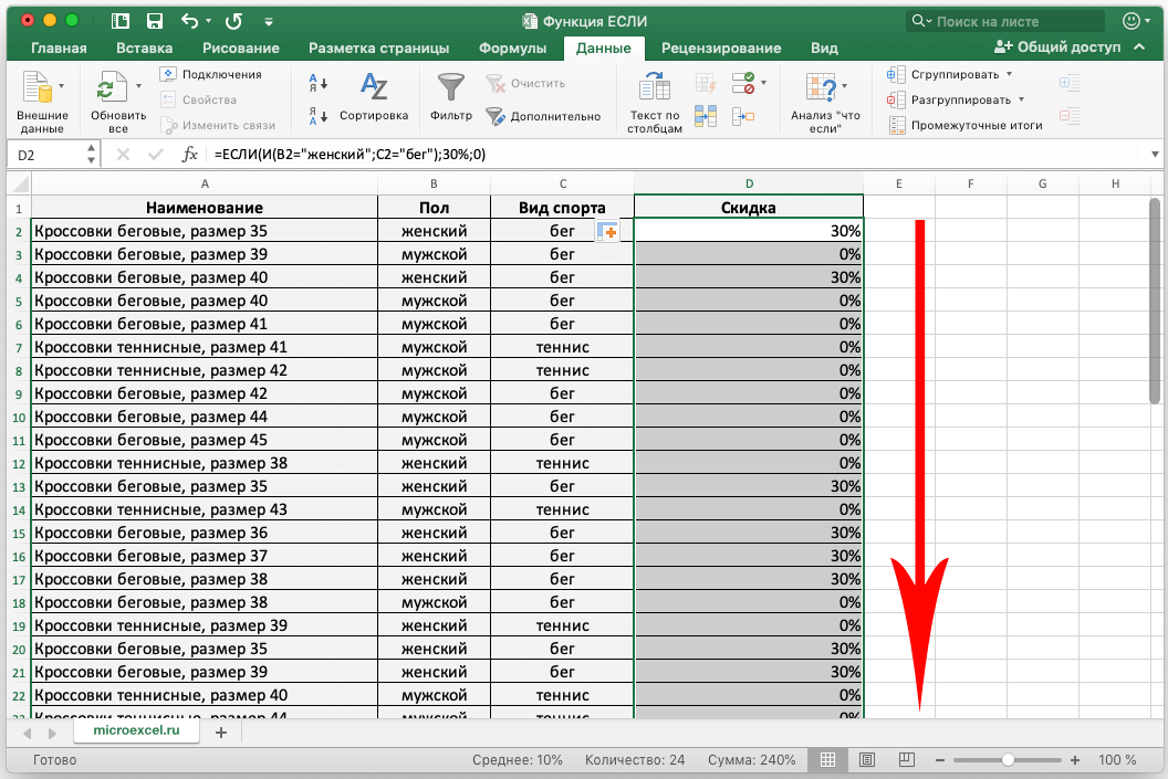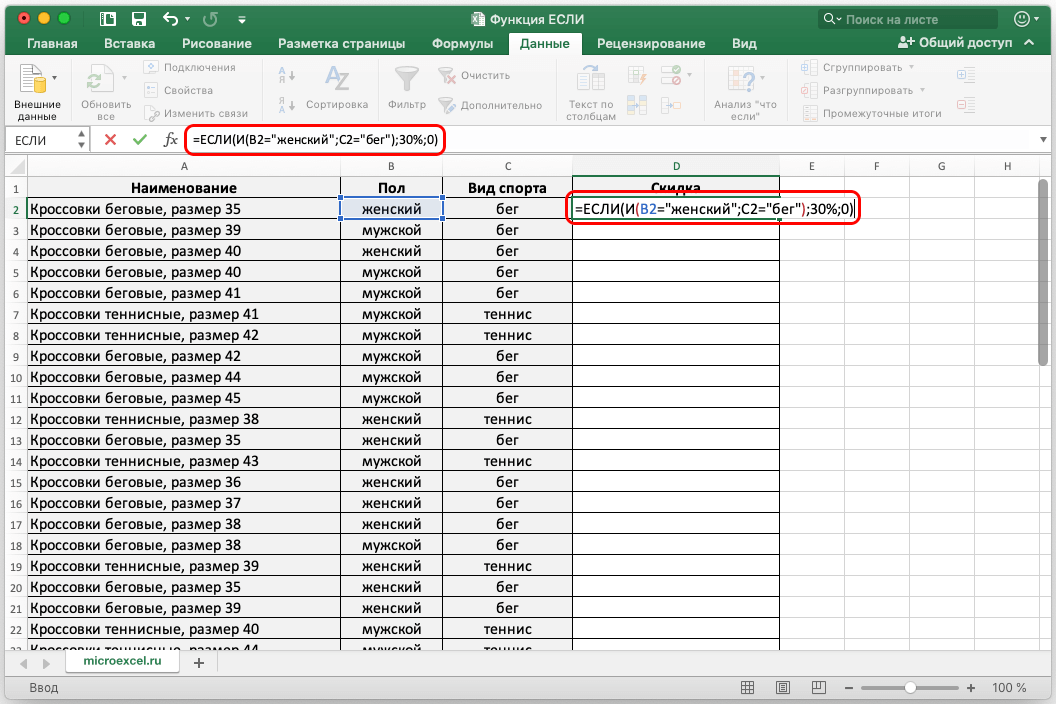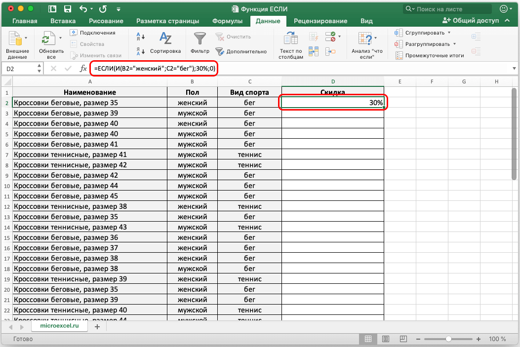 =ЕСЛИ(И(B2=”женский”;С2=”бег”);30%;0)