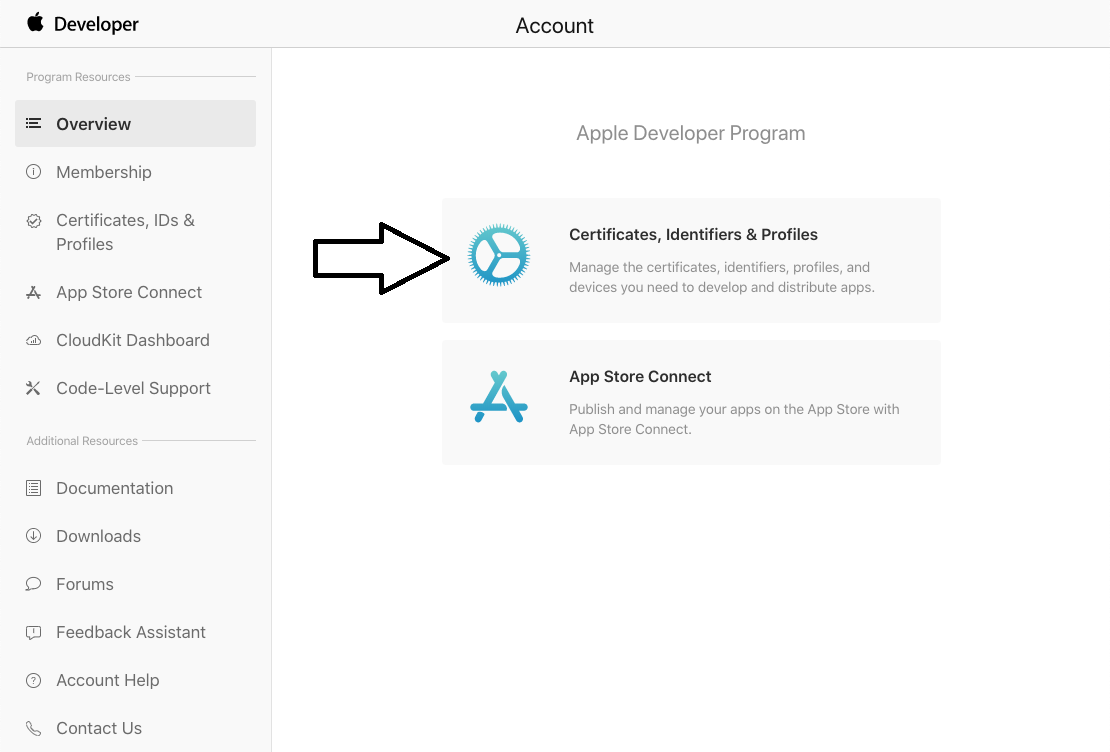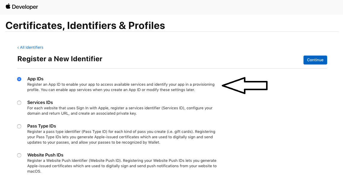 Кликните по Certificates, Identifiers & Profiles, затем выберите Identifiers в меню слева.