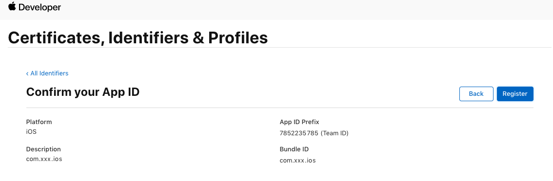 Проверьте данные и нажмите Register, чтобы зарегистрировать идентификатор.