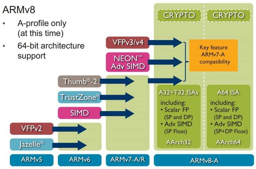 Обновленную архитектуру процессоров семейства ARMv8 окрестили именем AArch64. Она получила 64-битный набор инструкций и возможность работать с большим объемом оперативной памяти (4 Гбайт и больше). Само собой, предусмотрена совместимость с 32-битными приложениями (AArch32). Другими важными нововведениями ARMv8 стали: