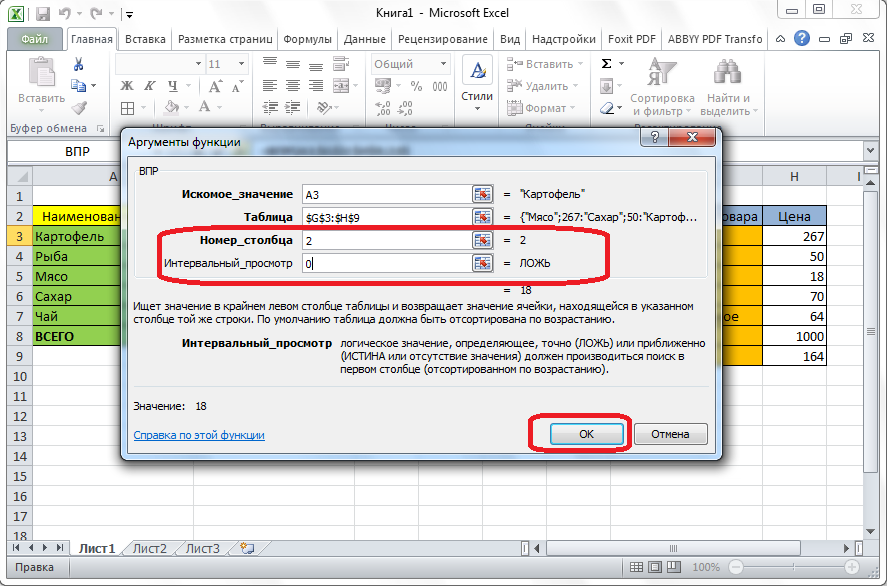 - «Номер столбца». Номер столбца, содержащий возвращаемое значение.