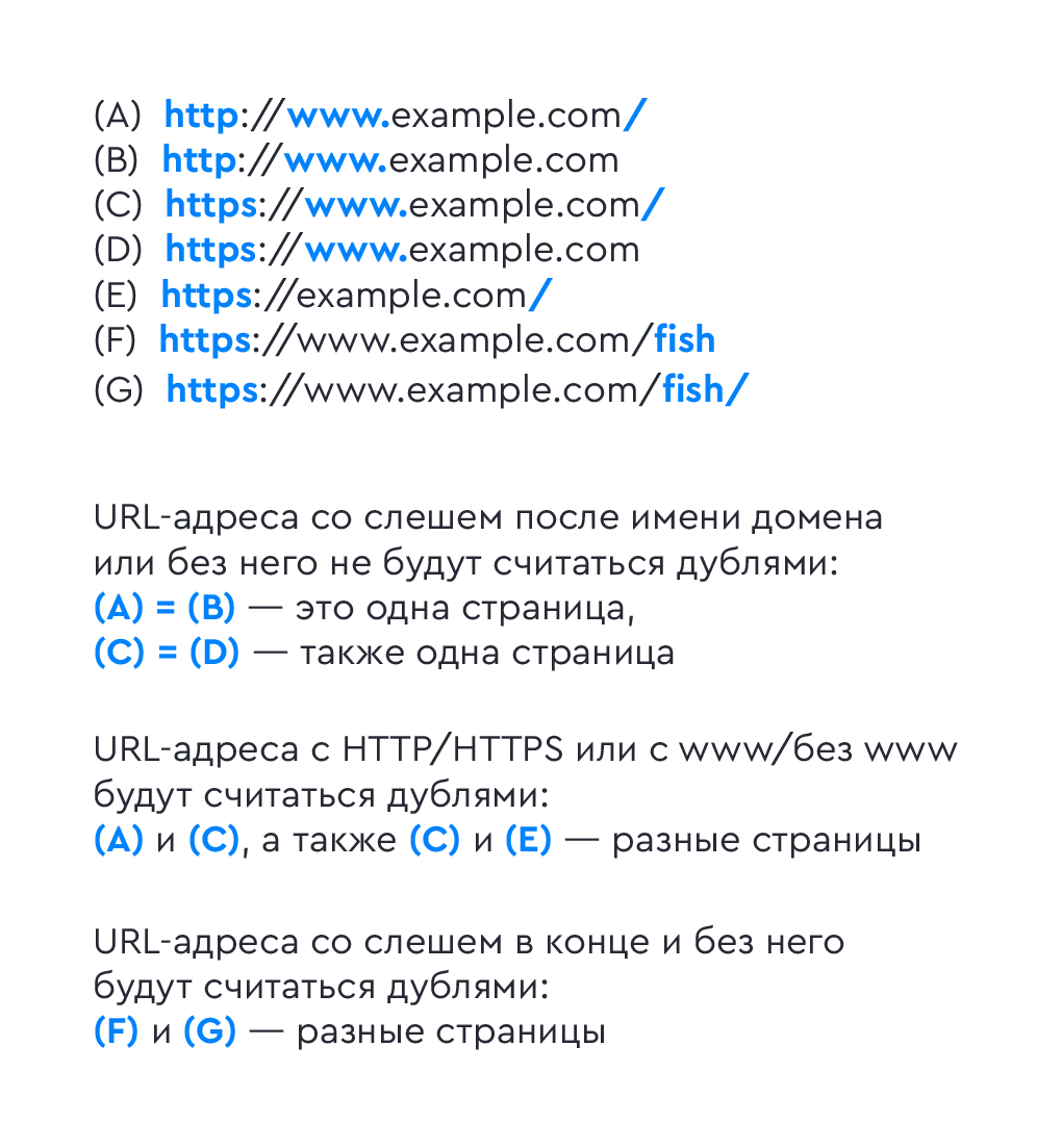 Как вы видите, иногда завершающие слеши приводят к дублированию, а иногда нет. Например, в варианте F и G можно легко получить дублированный контент.