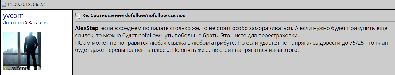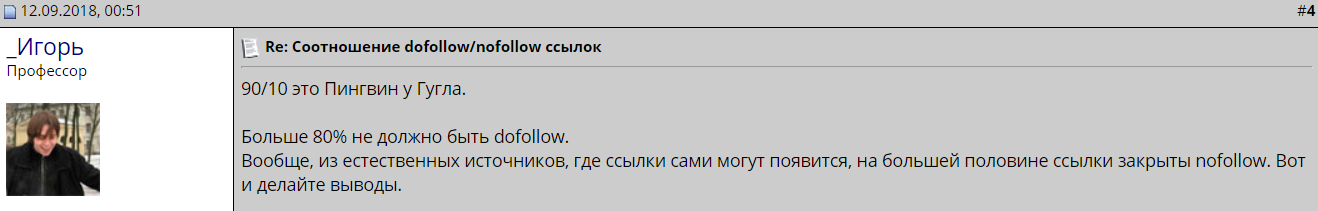 На форумах мы встречали советы от юзеров про то, что ссылок dofollow не должно быть больше 80%: 80% или 75% dofollow и соответственно 20% или 25% nofollow. Данные не подкреплены экспериментами или заявлениями представителей ПС, опыт некоторых оптимизаторов показывает, что такое соотношение ссылок оптимально.