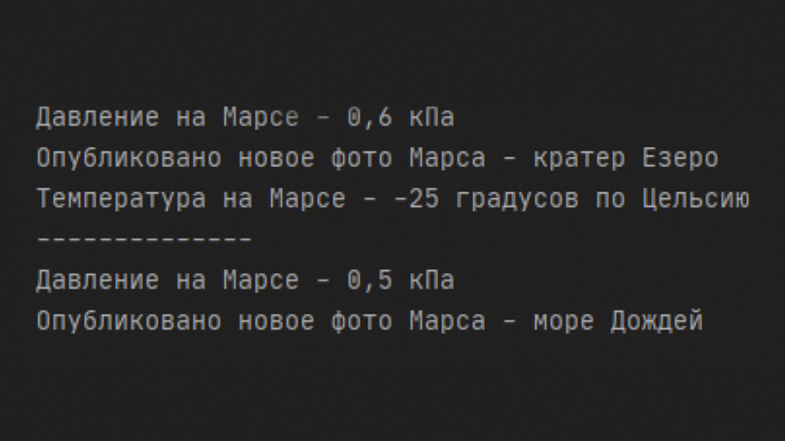 Вывод в консоли после запуска программы. Скриншот: Екатерина Степанова / Skillbox Media