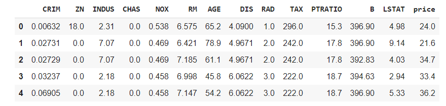 import numpy as np # линейная алгебраimport pandas as pd # обработка данных, CSV файл ввода-вывода (например, pd.read_csv)from sklearn.datasets import load_bostonboston = load_boston()df = pd.DataFrame(data=boston.data,columns=boston.feature_names)df=boston.targetdf.head()