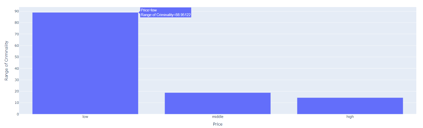 import plotly.express as pxfig = px.bar(df_price, x='price_levels', y='CRIM', labels={'price_levels':'Price','CRIM':'Range of Criminality'})fig.show()