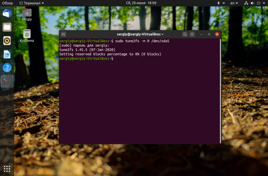 Здесь опция -m указывает процент зарезервированного места, а /dev/sda5 — это ваш диск, который надо настроить. После этого места должно стать больше.
