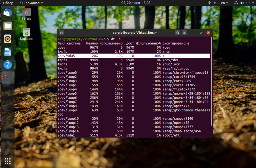 На точки монтирования, начинающиеся со слова snap внимания можно не обращать. Команда отображает общее количество места на диске, занятое и доступное место, а также процент занятого места. В данном случае 100% занято для корневого раздела — /dev/sda5. Конечно, надо разобраться какая программа или файл заняла всё место и устранить эту проблему, но сначала надо вернуть систему в рабочее состояние. Для этого надо освободить немного места. Рассмотрим что можно сделать чтобы экстренно освободить немного памяти.