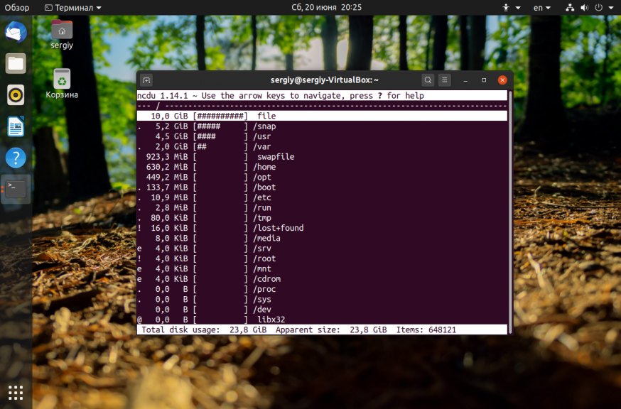 После выполнения всех перечисленных выше рекомендаций, у вас уже должно быть достаточно свободного места для установки специальных утилит очистки системы. Для начала вы можете попытаться найти самые большие файлы и если они не нужны — удалить их. Возможно какая-либо программа создала огромный лог файл, который занял всю память. Чтобы узнать что занимает место на диске Linux можно использовать утилиту ncdu: