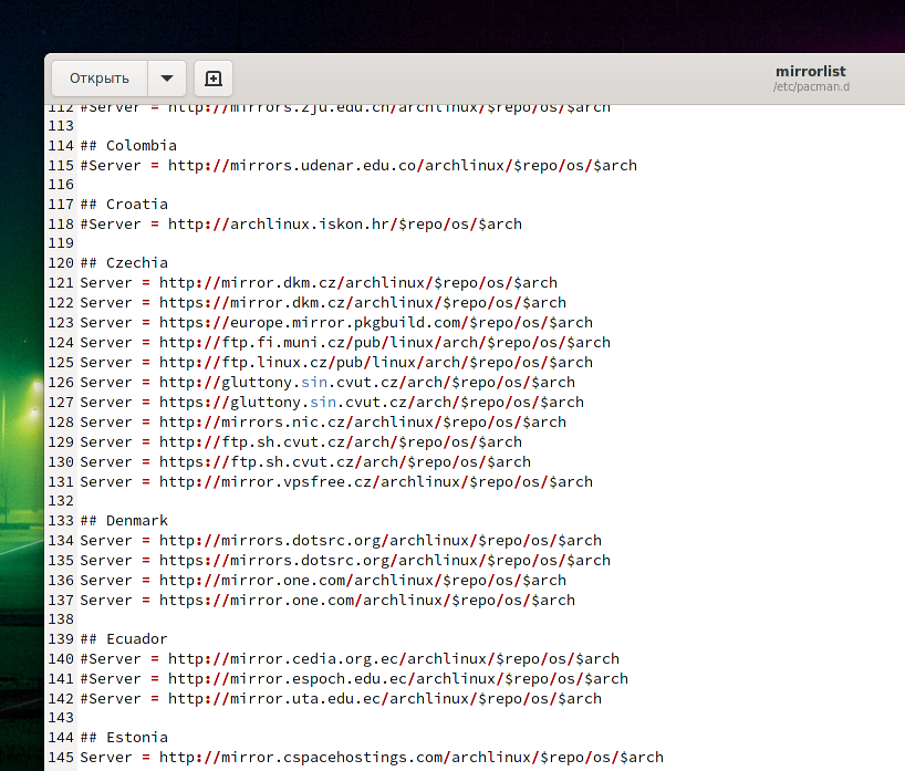 Это не всё — дело в том, что в файле /etc/pacman.d/mirrorlist по умолчанию все зеркала закомментированы, то есть отключены. Чтобы это исправить, откройте данный файл:
