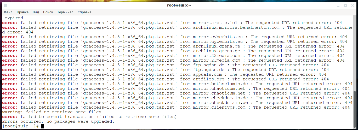 error: failed retrieving file 'goaccess-1.4.5-1-x86_64.pkg.tar.zst' from mirrors.evowise.com : The requested URL returned error: 404 error: failed retrieving file 'goaccess-1.4.5-1-x86_64.pkg.tar.zst' from mirror.rackspace.com : The requested URL returned error: 404 error: failed retrieving file 'goaccess-1.4.5-1-x86_64.pkg.tar.zst' from mirror.rackspace.com : The requested URL returned error: 404 error: failed retrieving file 'goaccess-1.4.5-1-x86_64.pkg.tar.zst' from mirror.dkm.cz : The requested URL returned error: 404 error: failed retrieving file 'goaccess-1.4.5-1-x86_64.pkg.tar.zst' from mirror.dkm.cz : The requested URL returned error: 404 error: failed retrieving file 'goaccess-1.4.5-1-x86_64.pkg.tar.zst' from europe.mirror.pkgbuild.com : The requested URL returned error: 404 .................................................................... .................................................................... .................................................................... warning: failed to retrieve some files error: failed to commit transaction (failed to retrieve some files) Errors occurred, no packages were upgraded.
