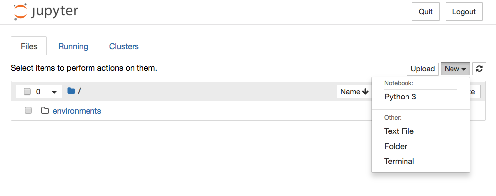 Jupyter Notebook автоматически покажет все файлы и папки, хранящиеся в каталоге, откуда выполняется запуск. Создайте новый файл блокнота, нажав New (Создать) и выбрав Python 3 в правом верхнем углу информационной панели Notebook: