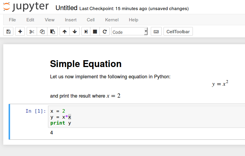 Теперь выполним простое уравнение и распечатаем результат. Нажмите Insert > Insert Cell Below (Вставка > Вставить ячейку снизу), чтобы вставить ячейку. Введите в новую ячейку следующий код: