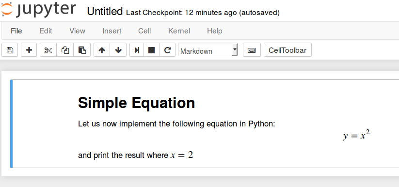 В новом блокноте измените первую ячейку так, чтобы она принимала синтаксис разметки. Для этого нажмите Cell > Cell Type > Markdown (Ячейка > Тип ячейки > Разметка) на панели навигации сверху. Помимо разметки этот тип ячейки также позволяет записывать уравнения в LaTeX. Например, введите в ячейку следующее после ее переключения на разметку: