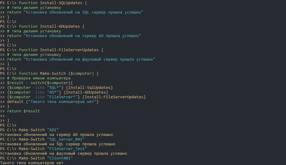 Другой пример Switch это вызов функции в зависимости от переданных параметров. На примере ниже я вызываю функцию, в которой находится Switch. В эту функцию я передаю имя компьютера, которое проверяется на упоминание указанных фраз и вызывает соответствующую функцию. Каждая функция, которая устанавливает обновления, возвращает значение в Switch, а затем происходит return внутри нее: