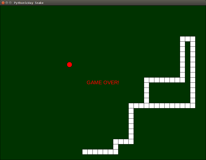 Вот такая у нас получилась змейка на Python. Попробуйте немного усовершенствовать игру, например, добавить счет, ускорение игры, отредактировать функцию create_block чтобы новые яблоки не появлялись на самой змейке, или реализовать систему уровней.UPD: В репозитории добавлен вариант с перезапуском игры после проигрыша.