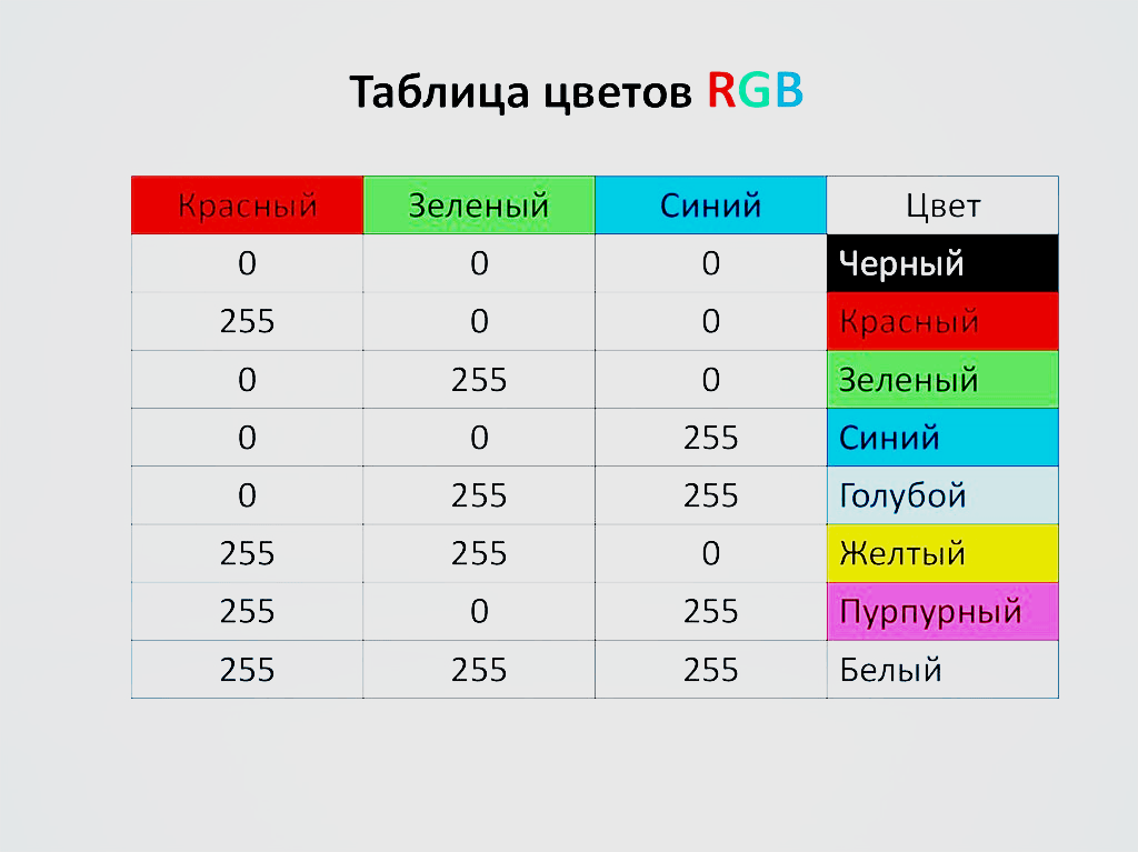 Каждый из трех основных цветов может иметь значение от 0 (выключен) до 255 (включен на 100%), так что для каждого элемента есть 256 вариантов.